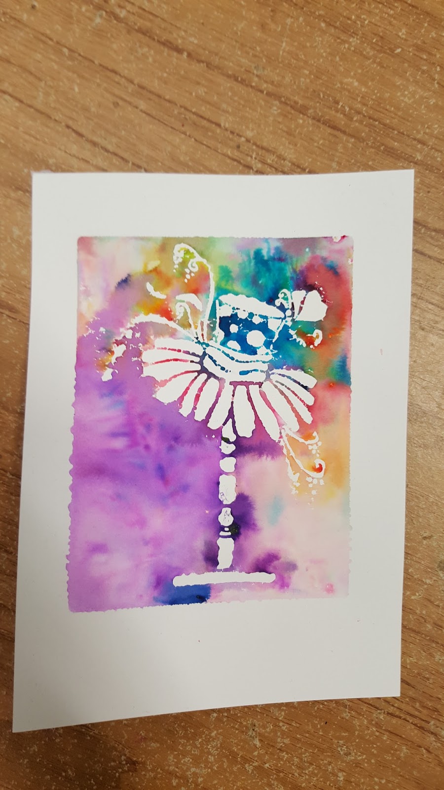 Anyway, thought I'd share a card I made a few weeks back. Background is done using Ken Oliver Color Burst, then I stamped with versa mark and embossed using WOW powders. Flowers are Tim Holtz wildflower.